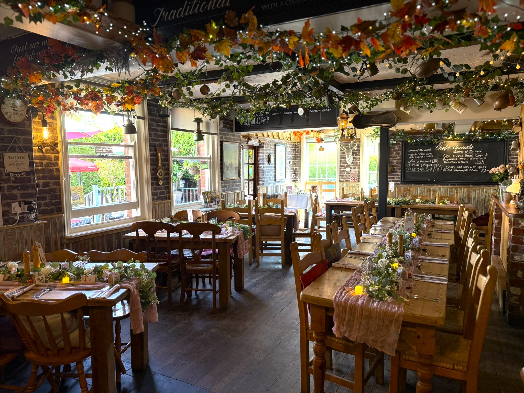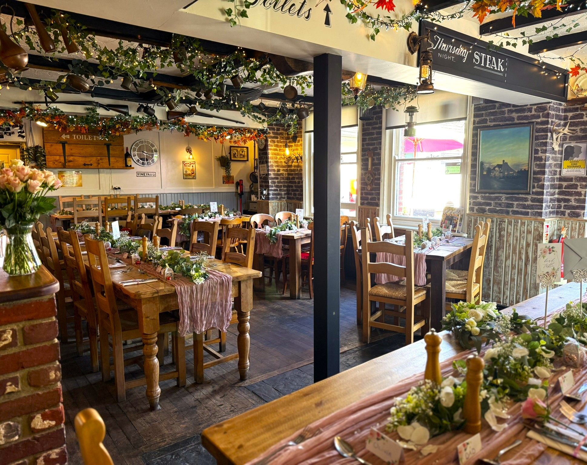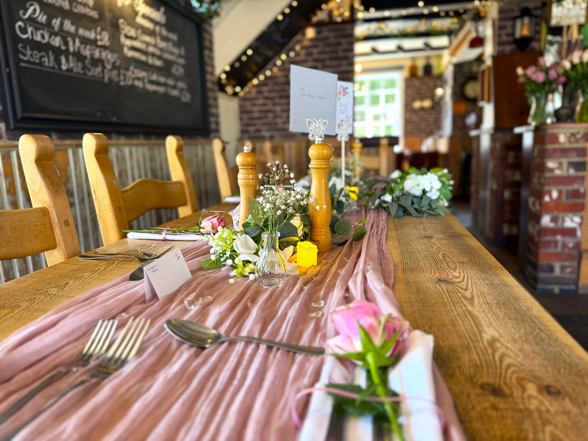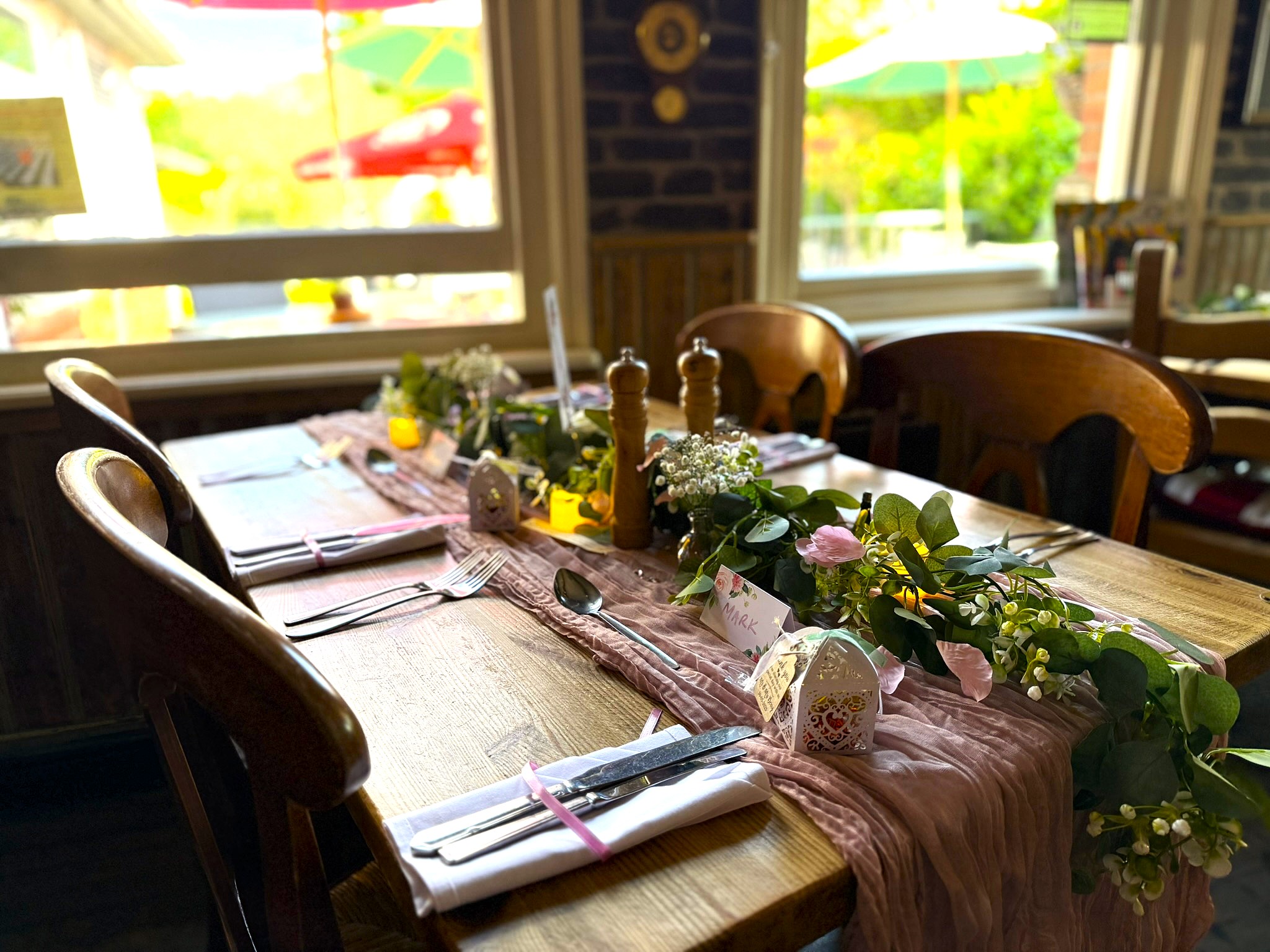 A typical wedding reception includes a sit-down meal lasting 2–3 hours, followed by time to celebrate with family and friends in our traditional pub and garden setting.